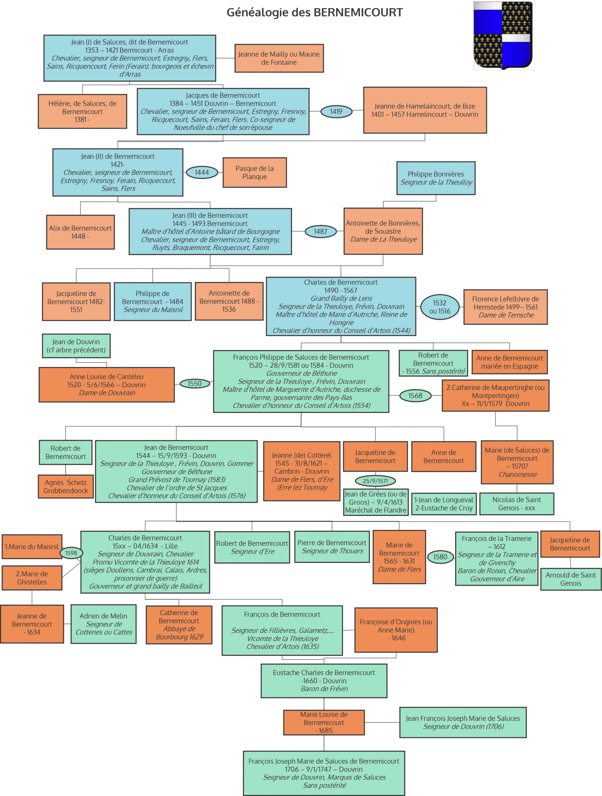 - François (Philippe) de Bernemicourt 1520 – 28/9/1581 (ou 1584). Seigneur de Douvrin et gouverneur de Béthune au XVIème, sa première femme (Anne) Louise de Canteleu de Douvrin (décédée 5/6/1566). Chevalier d’honneur au Conseil d’Artois (cour des Pays-Bas et armée espagnole) à partir de 1554, gouverneur civil et militaire de Béthune, seigneur de La Thieuloye, de Frévin-Capelle, maître d’hôtel de Marguerite d’Autriche, duchesse de Parme, régente des Pays-Bas. Il a épousé en secondes noces Catherine d’Omont et de Maupertinghe (décédée 1/1/1579). Ils sont enterrés tous les trois dans l’église de Douvrin (pierres tombales de marbre bleu). Les obsèques de François ont été célébrées dans l’église St Barthélémy de Béthune le 5/11/1584.